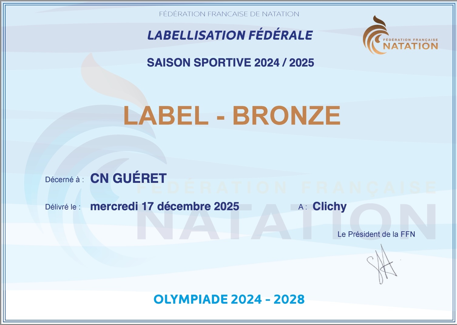 Le Comité Directeur de la Fédération Française de Natation, après examen de notre dossier par la commission fédérale labellisation, a décidé, au cours de la séance du mercredi 17 décembre 2025, de nous attribuer le label : BRONZE.